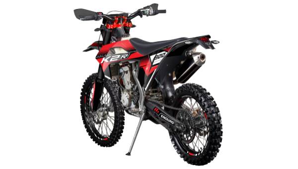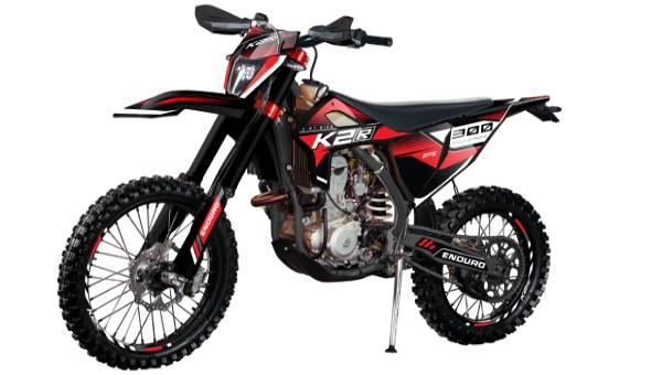 В базовое оснащение модели K2R 300 EFE входит все необходимое для полноценной езды: защита рук, защита радиатора и картера двигателя, защита прогрессии задней подвески, неломающиеся ручки тормоза и сцепления, power bomb на выпуске, датчик моточасов и светодиодная фара головного освещения.